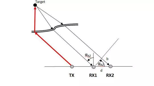 方位角αAZ是通過毫米波雷達接收天線RX1和接收天線RX2之間的幾何距離d,以及兩根毫米波雷達天線所收到反射回波的相位差b,然后通過三角函數計算得到方位角αAZ的值,這樣就可以知道被監(jiān)測目標的方位角了。